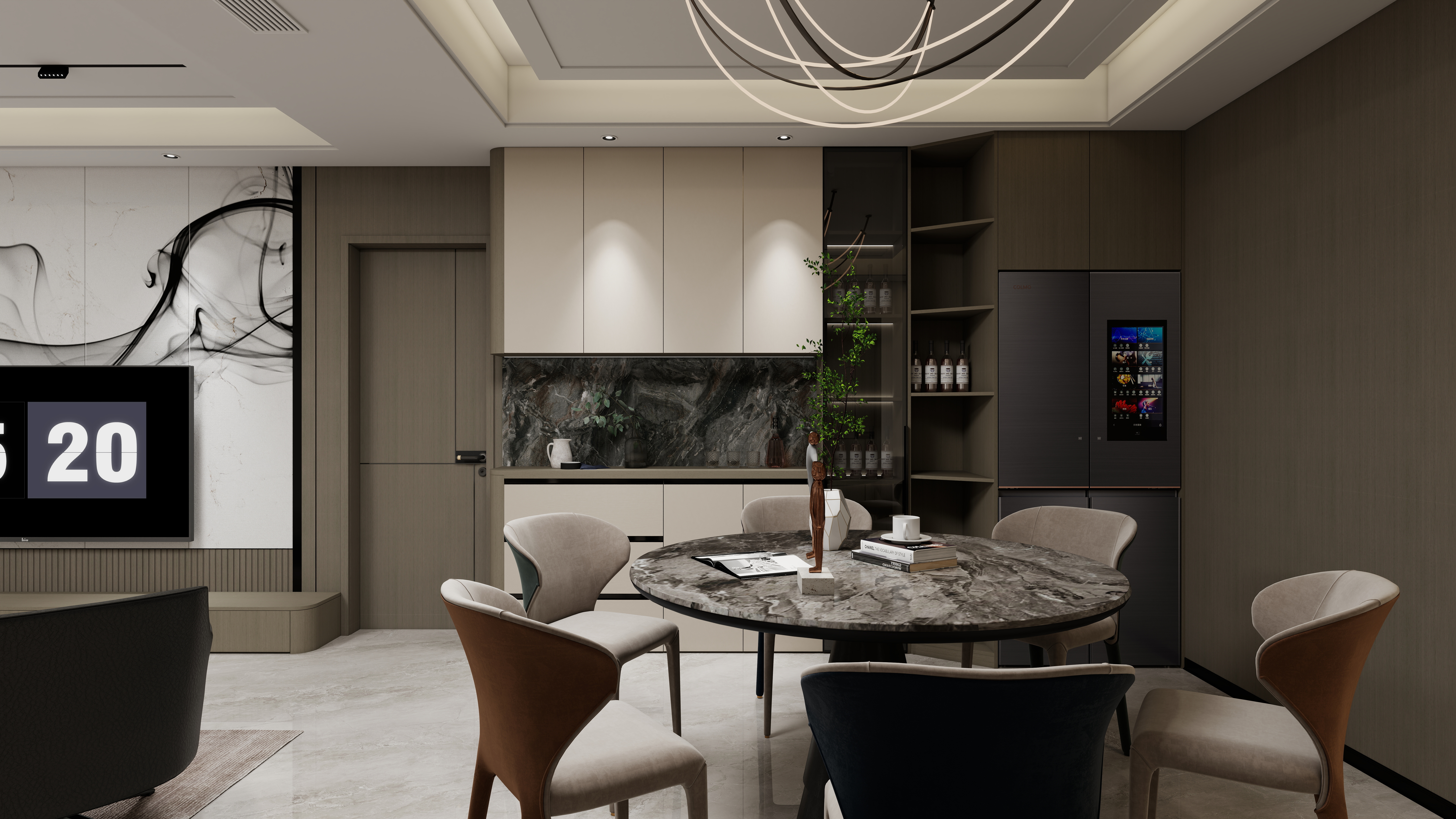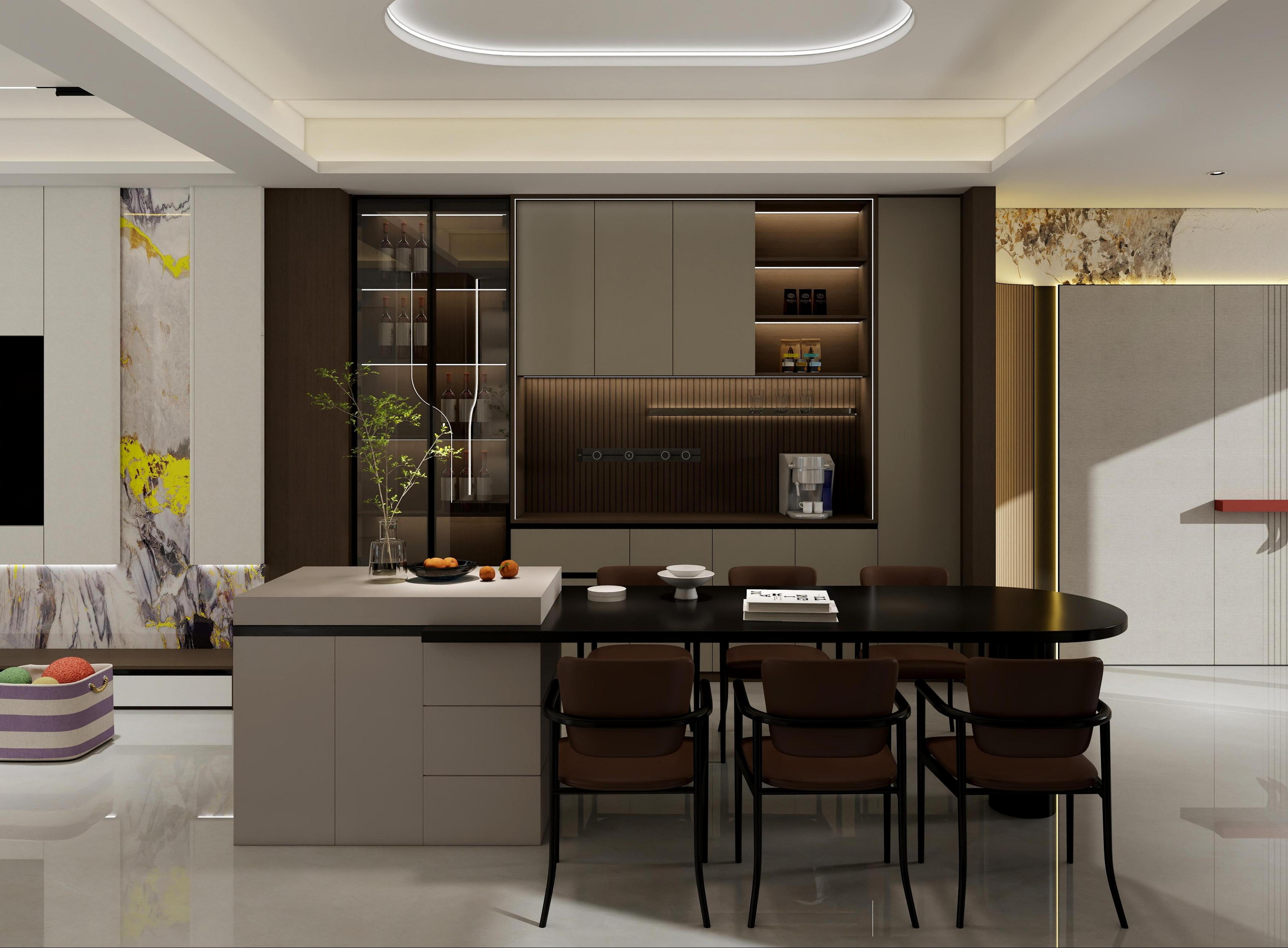 本案以170㎡的敞闊空間為畫卷,執(zhí)筆隱奢極簡的設計哲學,為您勾勒一處身心皆安的品質(zhì)居所。我們秉持健康環(huán)保理念,通過頂、墻、門、柜的一體化整合設計,摒棄冗余裝飾,讓家的每一寸空間都流淌著舒適與寧靜。步入一體化客餐陽區(qū)域,視野豁然開朗。電視背景墻與沙發(fā)背景墻對向而立,與微復式結構共同撐起大宅氣度。陽臺休閑區(qū)巧妙嵌入,無論是午后品茗還是與友麻將,皆成忙里偷閑的愜意時光。L型轉(zhuǎn)角廚房動線流暢,與圓桌餐廳形成完美互動;餐廳一側,半開放式奢石餐邊柜成為視覺焦點,天然的紋理與溫潤的木色相映成趣,在簡約中暗藏奢華質(zhì)感。私密區(qū)域同樣匠心獨運。兒童房將書桌、衣柜與睡眠區(qū)一體化定制,功能完備且渾然天成,助力孩子專注學習與健康成長。主臥與次臥延續(xù)靜謐格調(diào),一門到頂?shù)囊鹿翊钆錁O簡拉手設計,線條利落純粹,在擴大收納空間的同時,極大提升了視覺上的延伸感,營造出令人放松的睡眠環(huán)境。全案通過高級木飾面、定制系統(tǒng)柜與奢石元素的極致組合,不止于視覺上的高級大氣,更致力于為您打造一個從身體到心靈都倍感健康、安舒與從容的理想家。more+