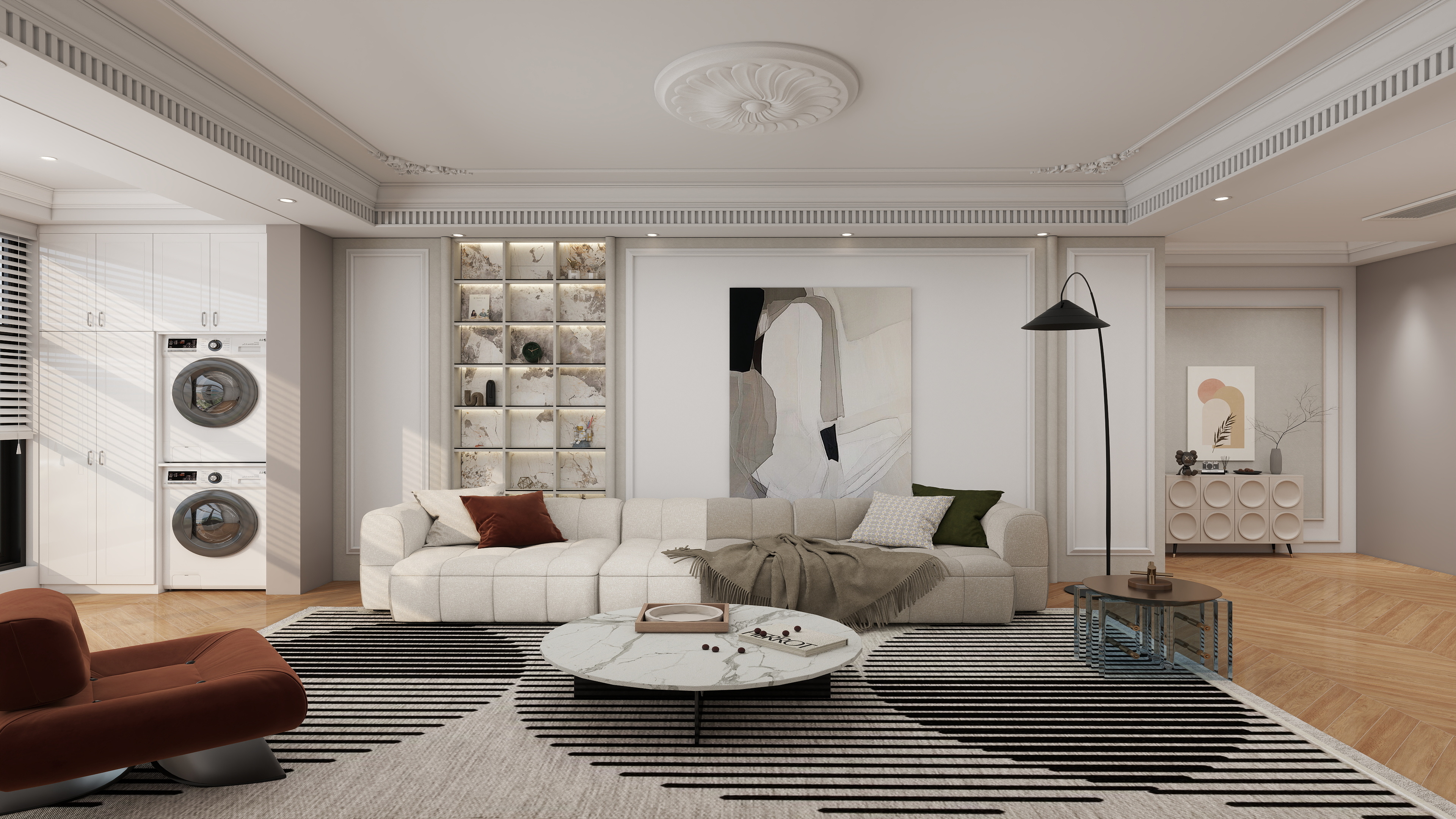 150㎡整裝以宋式風(fēng)雅為魂,融合現(xiàn)代人居理念,打造至簡至美的高端生活場域。從頂、墻到門、柜一體貫通,材質(zhì)、光影與形態(tài)和諧共生,讓每一次歸家,皆是沉浸式的人文體驗(yàn)。客廳|懸浮曲面,光影寫意電視背景墻采用9A木健康墻板打造懸浮曲面,柔韌流暢;沙發(fā)背景嵌入3D打印宋式窗格畫,虛實(shí)交織,勾勒出簡約而深邃的東方意境。餐廚|圓融有序,隱逸之美餐廳以中式圓桌呼應(yīng)半開放餐邊柜,電器嵌入、一門到頂,秩序中見豐盈。廚房延續(xù)深白配色,靜謐純粹,煙火亦成詩。臥室套間|功能與形制交融主臥以U型轉(zhuǎn)角柜構(gòu)建衣帽、梳妝與衛(wèi)浴一體的大套房,造型別致,儀式感十足。次臥拆除飄窗改為榻榻米,輔以蒲團(tuán)茶席,休閑與休憩自如切換。書房與兒童房|東方意境與巧思并存書房借水墨江山畫與深胡桃木書柜營造靜心讀寫之境。兒童房巧妙延伸定制柜作床頭柜,釋放活動空間,兼顧成長與雅趣。全屋以宋為韻,以整裝為筆,不僅統(tǒng)一了視覺美學(xué),更在細(xì)節(jié)中植入從容的生活節(jié)奏——這是一處可居、可賞、可安放身心的現(xiàn)代宋式雅居。more +01月