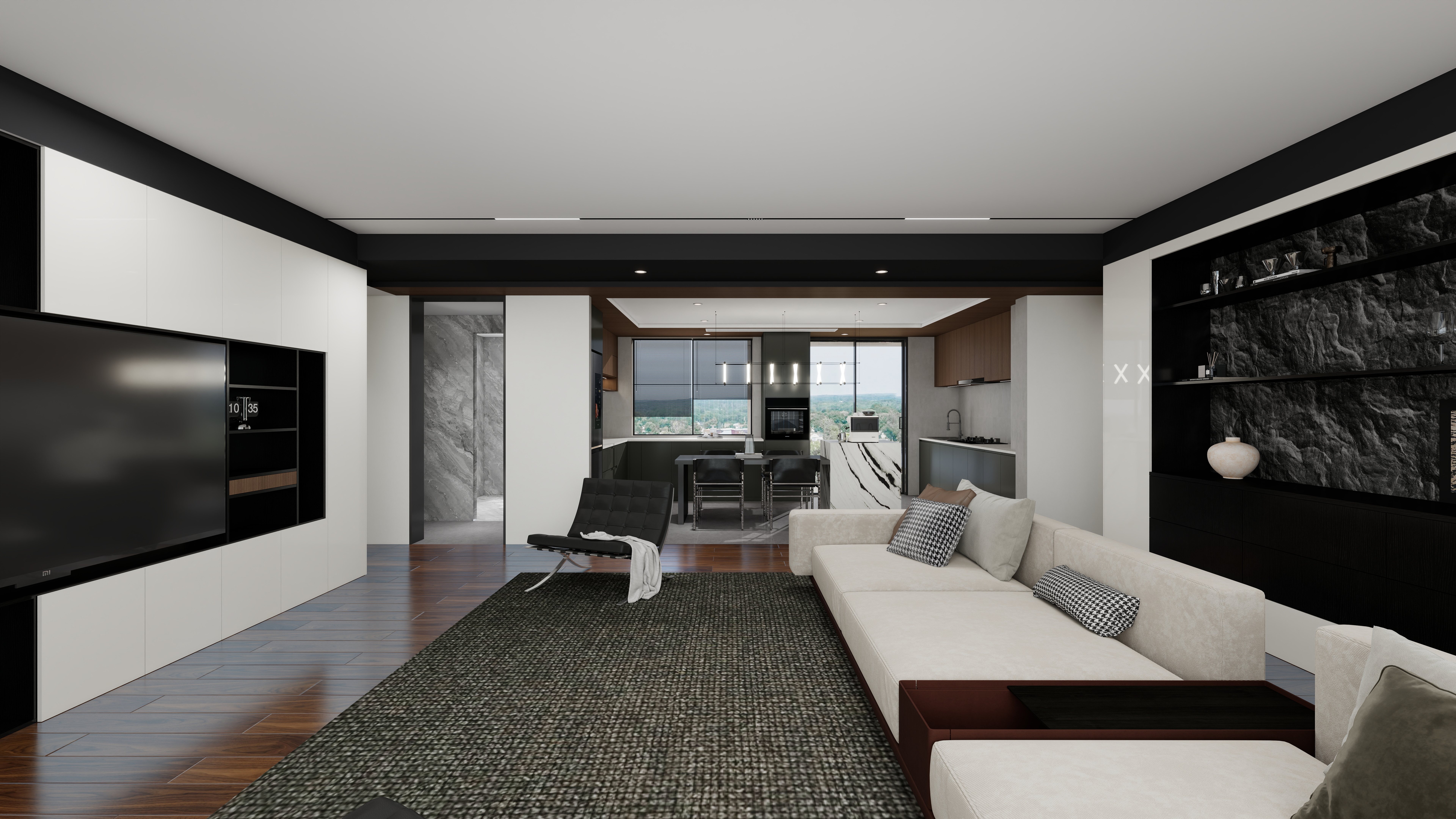 這套120㎡的居所,以侘寂美學為底色,通過頂墻門柜極致的黑白對比,勾勒出空間的清晰輪廓與深邃層次。黑,并非純粹的暗色,而是沉穩(wěn)的錨點;白,也非簡單的空曠,成為呼吸與光影的畫卷。客廳:定制的秩序感客廳的雙背景墻均采用頂天立地的定制柜體,以內(nèi)嵌形式消弭冗余。黑白柜面交織拼接,如同精心裝幀的書卷,在提供海量收納的同時,刻畫出立體而干凈的空間輪廓,奠定沉穩(wěn)大氣的基調(diào)。餐廚區(qū):圍合的溫度場采用開放式圍合布局,空間通透流暢。視線可毫無阻隔地延伸至廚房,讓家人備餐時的身影與笑語成為最動人的風景。一組深棕色的木質吊柜恰到好處地點綴其間,其溫潤的質感瞬間柔化了黑白的冷峻,為空間注入一絲暖意與高級感。玄關:延伸的巧思雖尺度精巧,卻通過延展式布局與半開放設計,巧妙化解局促。它既是歸家儀式感的起點,也高效承載了日常進出所需的收納,功能與形式達成微妙平衡。書房:專注的結界書房是黑白對比最為鮮明的場域。極致的色彩分割摒除一切紛擾,營造出冷靜、純粹的思考環(huán)境,有效提升專注力,讓精神在此迅速沉潛。臥室:織就的安寧雙臥室延續(xù)黑白主調(diào),并以深淺不同的棕色調(diào)和,交織出寧靜而舒適的睡眠氛圍。舍棄傳統(tǒng)飄窗布局,釋放出更多可利用空間,讓休憩體驗更為寬松自在。主衛(wèi):理性的升華主臥衛(wèi)生間采用同色系一體化設計,大理石墻面與蜂窩板無縫銜接。獨特的線性美學頂面設計,在純粹的黑白與利落的直線中,將功能與理性美學升華至新高度。在這里,生活被還原成一種素樸的儀式。每一處設計都服務于居住的本質——在鮮明的對比中尋得平衡,在質樸的材質里觸摸溫度,最終刻畫出一個鮮明、從容、充滿理性與深情的生活現(xiàn)場。more+NEW