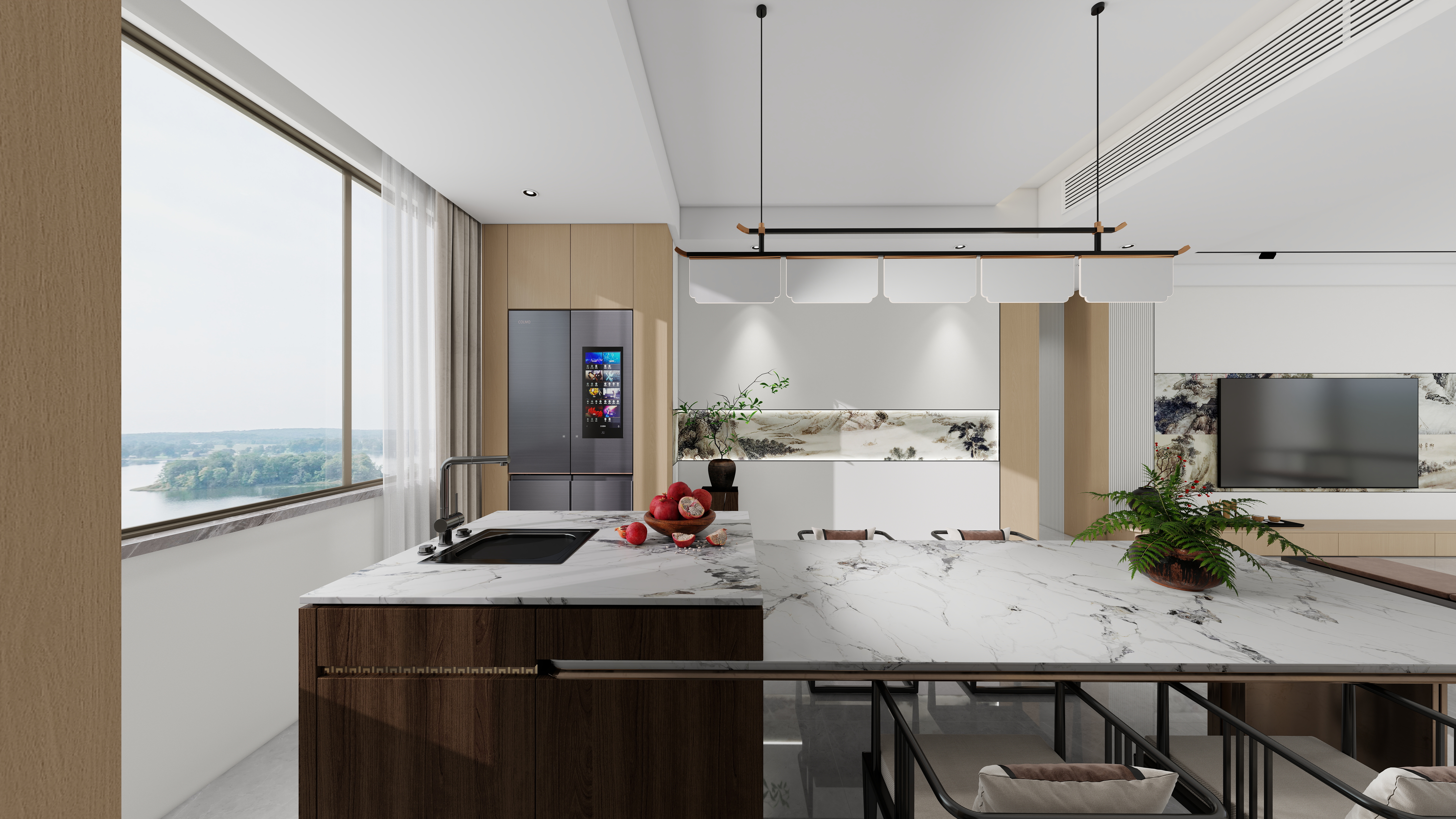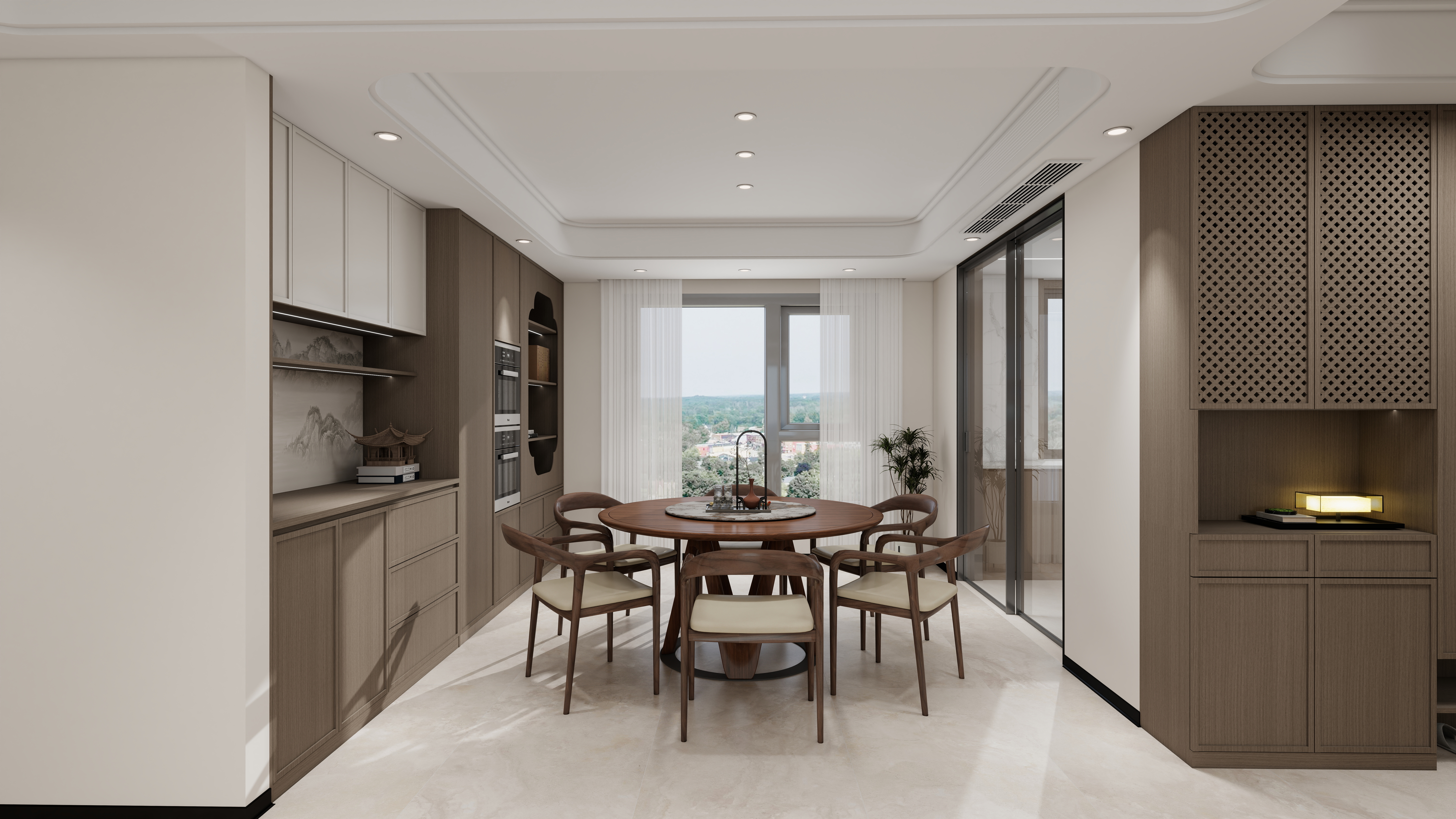 150㎡整裝以宋式風雅為魂,融合現(xiàn)代人居理念,打造至簡至美的高端生活場域。從頂、墻到門、柜一體貫通,材質、光影與形態(tài)和諧共生,讓每一次歸家,皆是沉浸式的人文體驗。客廳|懸浮曲面,光影寫意電視背景墻采用9A木健康墻板打造懸浮曲面,柔韌流暢;沙發(fā)背景嵌入3D打印宋式窗格畫,虛實交織,勾勒出簡約而深邃的東方意境。餐廚|圓融有序,隱逸之美餐廳以中式圓桌呼應半開放餐邊柜,電器嵌入、一門到頂,秩序中見豐盈。廚房延續(xù)深白配色,靜謐純粹,煙火亦成詩。臥室套間|功能與形制交融主臥以U型轉角柜構建衣帽、梳妝與衛(wèi)浴一體的大套房,造型別致,儀式感十足。次臥拆除飄窗改為榻榻米,輔以蒲團茶席,休閑與休憩自如切換。書房與兒童房|東方意境與巧思并存書房借水墨江山畫與深胡桃木書柜營造靜心讀寫之境。兒童房巧妙延伸定制柜作床頭柜,釋放活動空間,兼顧成長與雅趣。全屋以宋為韻,以整裝為筆,不僅統(tǒng)一了視覺美學,更在細節(jié)中植入從容的生活節(jié)奏——這是一處可居、可賞、可安放身心的現(xiàn)代宋式雅居。more+