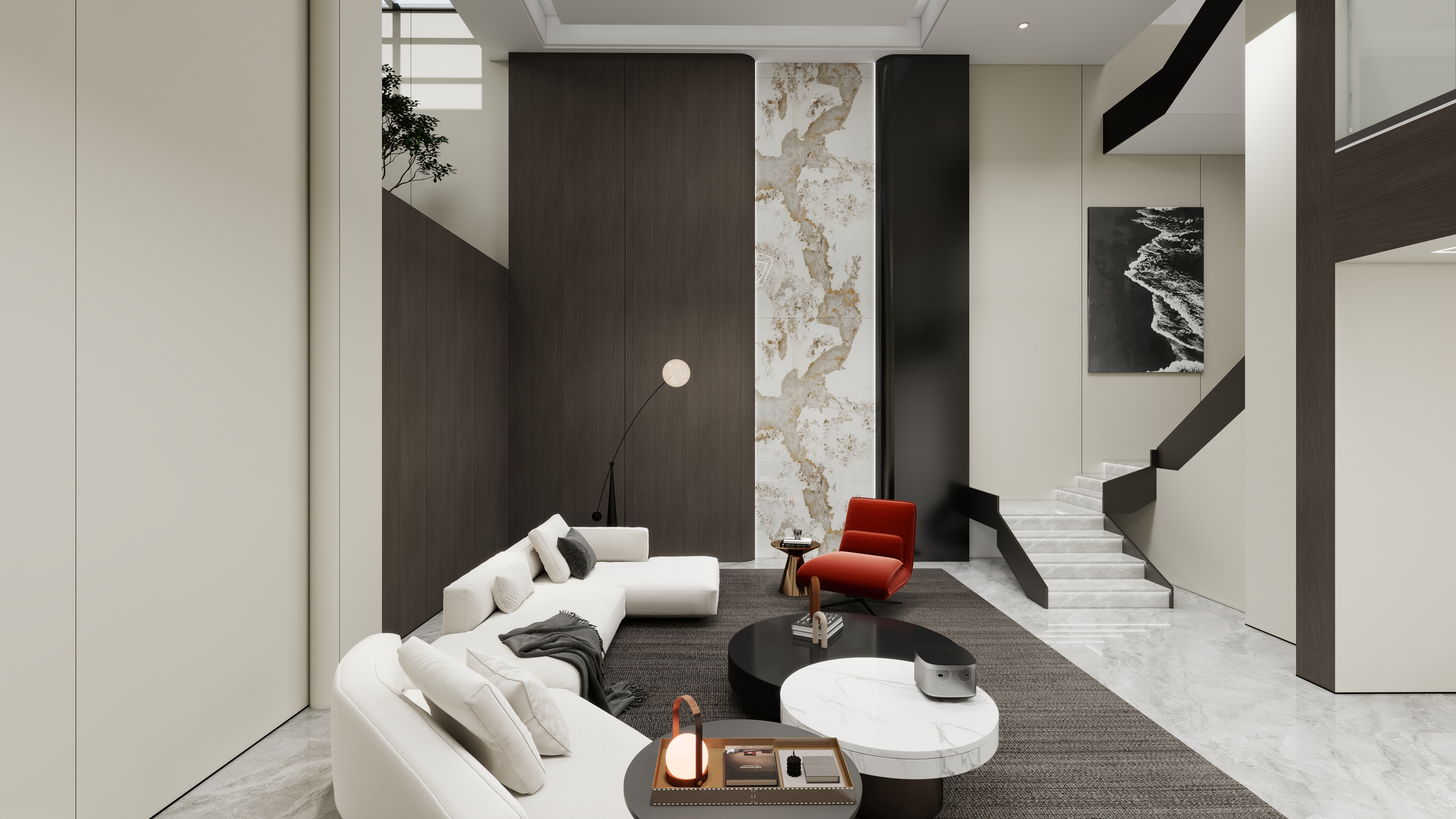 當混搭美學遇上雙層別墅,生活便不再是單一的場景重復。海創(chuàng)整裝以專業(yè)防潮工藝與整體統(tǒng)一設計,在此勾勒出明亮通透、功能交織的理想居所。地下與地上,風格交融,每一處皆成風景。地下一層 · 靜謐與活力共生入戶即景,藍金沙3D打印背景墻聚焦視線,與雙邊定制柜共同圍合出寬敞大氣的玄關。大堂采用挑空設計,白棕配色勾勒意式優(yōu)雅,天井下設景觀與長椅,引光入室,閑坐亦成詩。向內(nèi)延伸,是器械林立的健身區(qū),以及一處星空頂影音室——9A木健康墻板靜音降噪,在此沉浸視聽,奢享私密時光。一層 · 交融中西的休閑場域客廳延續(xù)輕奢意式格調(diào),藍金沙與深胡桃木背景墻,與玄關遙相呼應。茶室則大膽運用中國紅與白色碰撞,定制柜營造多層光影,除大茶桌外,更設休閑一角,便于促膝深談。新中式茶韻、意式慵懶、麻將社交、廚房煙火……多元場景自由切換,情感與溫度在此悄然流動。洞見空間哲學,演繹生活故事海創(chuàng)整裝,以統(tǒng)一設計語言貫通雙層空間,防潮工藝守護地下室明亮干燥。在這里,風格無界,功能無限,一切只為回歸居住的本真愜意。more+