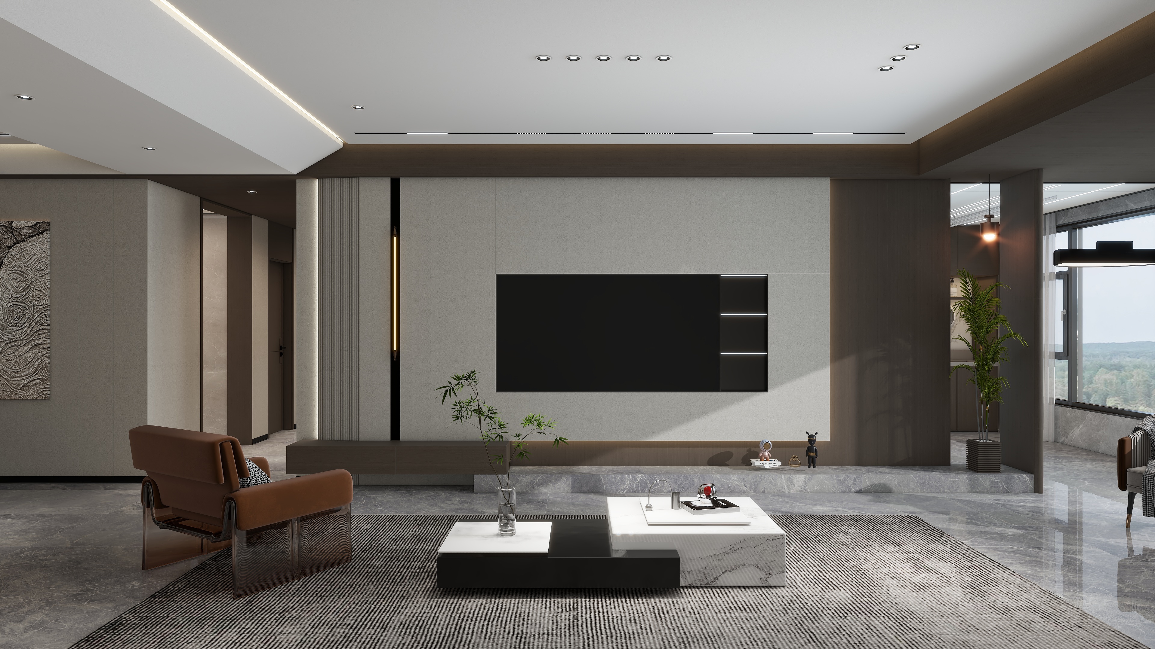 150㎡整裝以宋式風(fēng)雅為魂,融合現(xiàn)代人居理念,打造至簡(jiǎn)至美的高端生活場(chǎng)域。從頂、墻到門、柜一體貫通,材質(zhì)、光影與形態(tài)和諧共生,讓每一次歸家,皆是沉浸式的人文體驗(yàn)。客廳|懸浮曲面,光影寫意電視背景墻采用9A木健康墻板打造懸浮曲面,柔韌流暢;沙發(fā)背景嵌入3D打印宋式窗格畫,虛實(shí)交織,勾勒出簡(jiǎn)約而深邃的東方意境。餐廚|圓融有序,隱逸之美餐廳以中式圓桌呼應(yīng)半開放餐邊柜,電器嵌入、一門到頂,秩序中見豐盈。廚房延續(xù)深白配色,靜謐純粹,煙火亦成詩。臥室套間|功能與形制交融主臥以U型轉(zhuǎn)角柜構(gòu)建衣帽、梳妝與衛(wèi)浴一體的大套房,造型別致,儀式感十足。次臥拆除飄窗改為榻榻米,輔以蒲團(tuán)茶席,休閑與休憩自如切換。書房與兒童房|東方意境與巧思并存書房借水墨江山畫與深胡桃木書柜營造靜心讀寫之境。兒童房巧妙延伸定制柜作床頭柜,釋放活動(dòng)空間,兼顧成長與雅趣。全屋以宋為韻,以整裝為筆,不僅統(tǒng)一了視覺美學(xué),更在細(xì)節(jié)中植入從容的生活節(jié)奏——這是一處可居、可賞、可安放身心的現(xiàn)代宋式雅居。