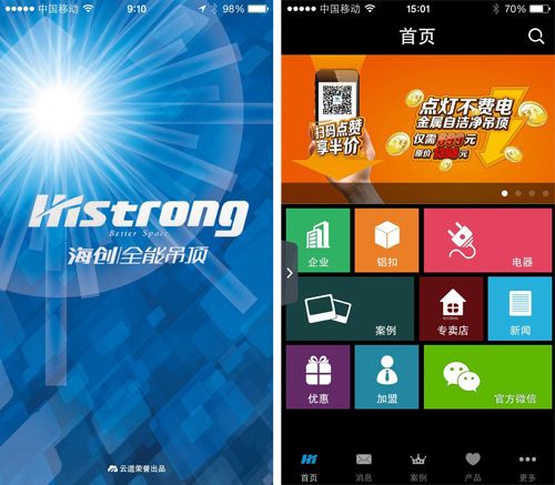 海創(chuàng)集成吊頂手機客戶端應(yīng)用APP的推出,展示出了海創(chuàng)集成吊頂品牌高瞻遠(yuǎn)矚的明銳營銷戰(zhàn)略,將企業(yè)、品牌與消費者之間通過APP架起了一座溝通的橋梁,為企業(yè)念珠更多用戶,帶來更多生意,同時也為加盟商更好地服務(wù)!