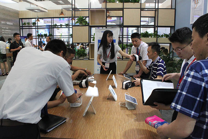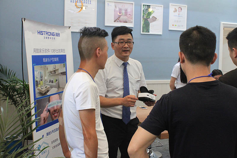 不少客戶在招商經(jīng)理的指引下,在海創(chuàng)展位品鑒新品,為頂墻一體的魅力所折服。不少客戶現(xiàn)場親自戴上VR眼鏡,通過酷家樂后臺,體驗海創(chuàng)720°家裝實景,感受更多風格。