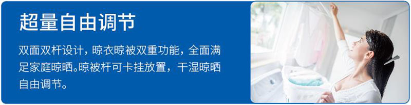 新增10根特色晾曬橫桿,方便小件衣服懸掛晾曬,輕松晾曬嬰兒衣物與毛巾,也可平放曬衣,增大晾曬面積,老人小孩可輕松實(shí)現(xiàn)操作。