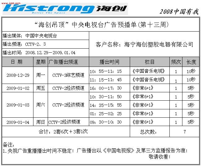 【最新資訊】“海創(chuàng)吊頂”中央電視臺(tái)廣告語(yǔ)預(yù)播單(2009年1月份)來(lái)源:海創(chuàng)集成吊頂十大品牌     發(fā)布時(shí)間:2008/9/28 12:38:37