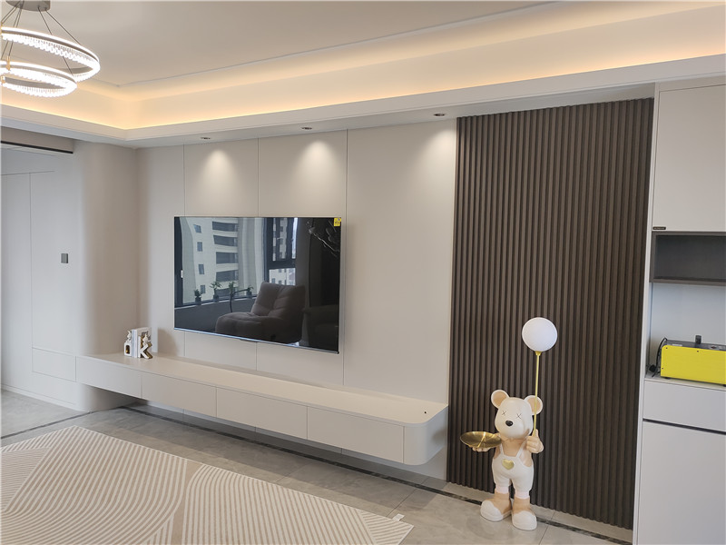 當原木的溫潤遇上清簡的設計,家便成了呼吸的詩。本案以海創(chuàng)頂墻門柜整裝定制,勾勒出一座自然寧靜的雙層居所,讓每一處細節(jié)都流露著和諧與定制之美。挑高大廳,氣勢貫通一層客廳采用挑高設計,9A木健康墻板電視背景墻縱向延伸至二層,巖紋木紋拼接,簡潔的線條與材質(zhì)的碰撞,賦予空間開闊大氣的視覺張力。過道靜謐,統(tǒng)一之美整體走廊與過道以白色與原木為主調(diào),鋁木靜音門與墻板同色定制,消除視覺割裂。巖紋穿插于木紋之間,悄然豐富著空間的層次與質(zhì)感。臥室舒緩,韻律交織多個臥室背景墻通過原木、巖紋與格柵的跳躍組合,實現(xiàn)統(tǒng)一中的變化。電視墻以對稱巖紋點綴,平衡秩序與靈動,營造出安寧且富有節(jié)奏的休憩氛圍。全屋依托海創(chuàng)9A木健康墻板、生態(tài)定制柜與靜音門系統(tǒng),將環(huán)保、靜音與美學融為一體,成就了一個真正量身定制、自然呼吸的家。more +12月