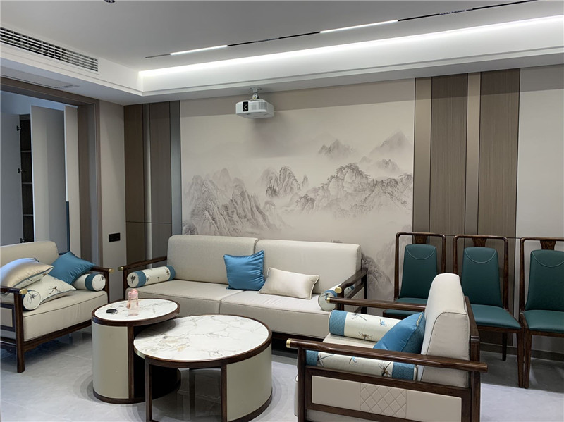 寬敞的大別墅特別適合新中的古樸設計,挑高大廳直接使用整塊6米的定制墻板,樹立開闊的空間氣勢;一幅意境深遠的山水畫客廳背景將人的思緒帶向遠方,仿佛尋夢而去。