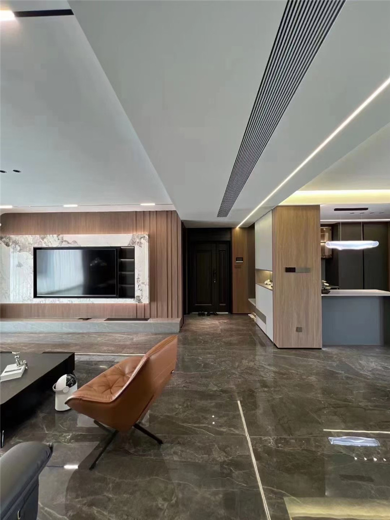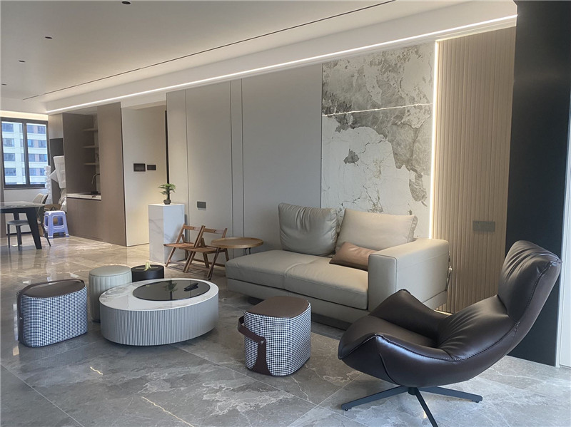 移步客餐廳,視野瞬間變得開闊,讓人忍不住發(fā)出“哇塞”的驚嘆。棕木紋色造型墻板與仿大理石紋組成的電視背景墻別具一格,客廳內(nèi)擺放的單椅沙發(fā)、方形茶幾、磁吸燈、定制柜等,讓溫潤玉白色、自然原木色、濃郁焦糖色等色系交織在空間內(nèi),營造出高級的格調(diào)感,整個空間顯得精致而高貴。