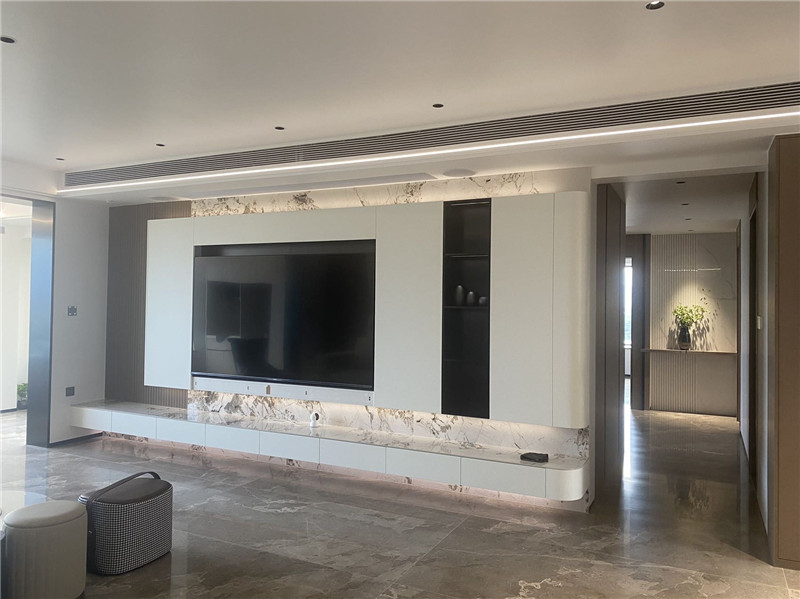 電視背景墻則是用更多的玉白色加深對比度,圓弧轉(zhuǎn)角流暢過渡過道和客廳空間,彌補(bǔ)了戶型上的不足。