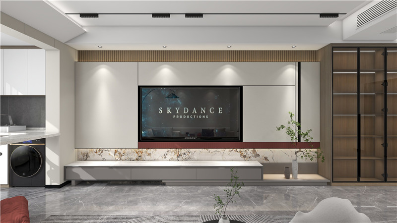 電視背景墻是整個空間視覺的焦點,則用大面積的拼接營造錯層立體造型,石紋、木紋與布紋,不同材質(zhì)的相互碰撞讓活力躍然于墻上。