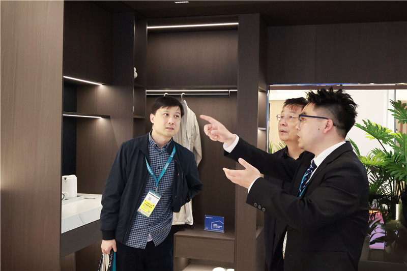 本次海創(chuàng)攜全新頂墻門柜參展,以酒店大床房套間體驗間形式呈現(xiàn),其過硬的產品品質、優(yōu)質的工藝細節(jié)、和諧統(tǒng)一的效果呈現(xiàn)吸引了不少中外客戶。