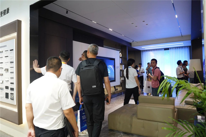 從外到內(nèi),海創(chuàng)展廳都把設(shè)計(jì)感發(fā)揮的淋漓盡致。路過的人群,總會(huì)把目光交給海創(chuàng);展廳內(nèi)部,也匯聚了不少游客,特別是這面背景墻和樣品的展示區(qū)。