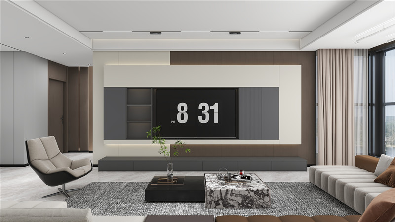 客廳的一側(cè),是一面深色的定制收納柜,柜門采用無(wú)拉手設(shè)計(jì),與墻面完美融合,內(nèi)部合理的分區(qū)滿足了收納與展示的需求。