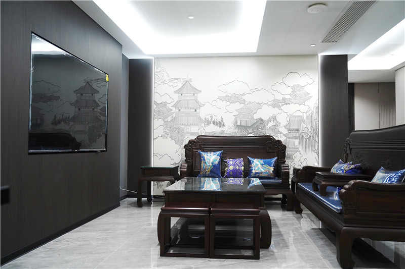 步入客廳,恢弘氣度,空間豁然開朗。以9A木上墻做簡約吊頂,線條利落流暢,與同色系背景墻、定制門柜無縫銜接,視覺延展性極強(qiáng),盡顯開闊。背景墻紋理含蓄而富有質(zhì)感,與整體空間色調(diào)和諧共生,奠定新中式沉穩(wěn)大氣的基調(diào)。