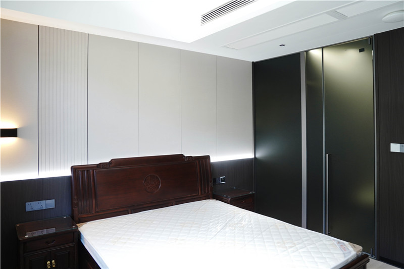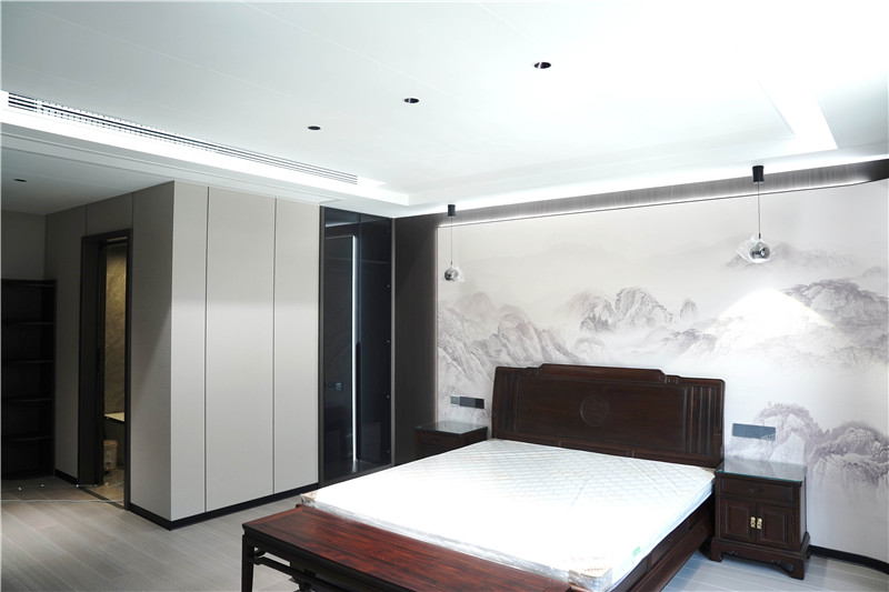 二層作為主要休息區(qū),分布著舒適的客房與主人臥室。海創(chuàng)室內(nèi)套裝門系統(tǒng)確保了空間的私密與寧靜。步入式衣柜采用頂天立地設(shè)計,門板與墻面同色同質(zhì),視覺上形成完整塊面,極大地弱化了柜體的存在感,營造出純粹、放松的睡眠環(huán)境。