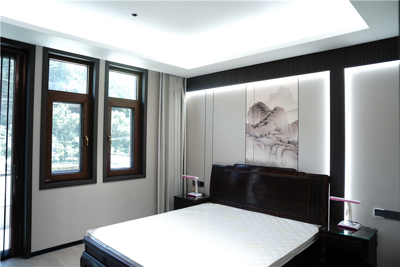 客廳一側(cè)的獨(dú)立茶室,是點(diǎn)睛之筆。海創(chuàng)9A級環(huán)保木格柵,以精湛工藝在頂部構(gòu)筑出起伏的“山墻”屋頂造型,木色溫潤,紋理自然。這不僅是對傳統(tǒng)建筑元素的現(xiàn)代演繹,更與窗外綿延山景形成巧妙呼應(yīng)。在此品茗,光影透過格柵灑落,仿佛置身山林懷抱,禪意悠遠(yuǎn)。