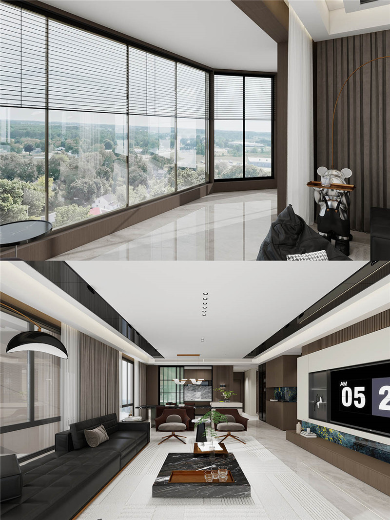 超大環(huán)繞式陽(yáng)臺(tái)將自然光與風(fēng)景無(wú)縫接入室內(nèi),與滿墻電視柜相呼應(yīng)。電視墻以藍(lán)金大理石紋局部點(diǎn)綴,輕奢質(zhì)感悄然流露,成為視覺(jué)焦點(diǎn)。