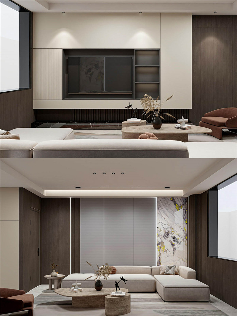 對于追求更簡約視覺的家庭,微復式電視墻是不二之選。通過材質(zhì)的碰撞與輕微的體塊落差,營造出簡約而不簡單的立體輪廓,無需過多裝飾,自成一景。