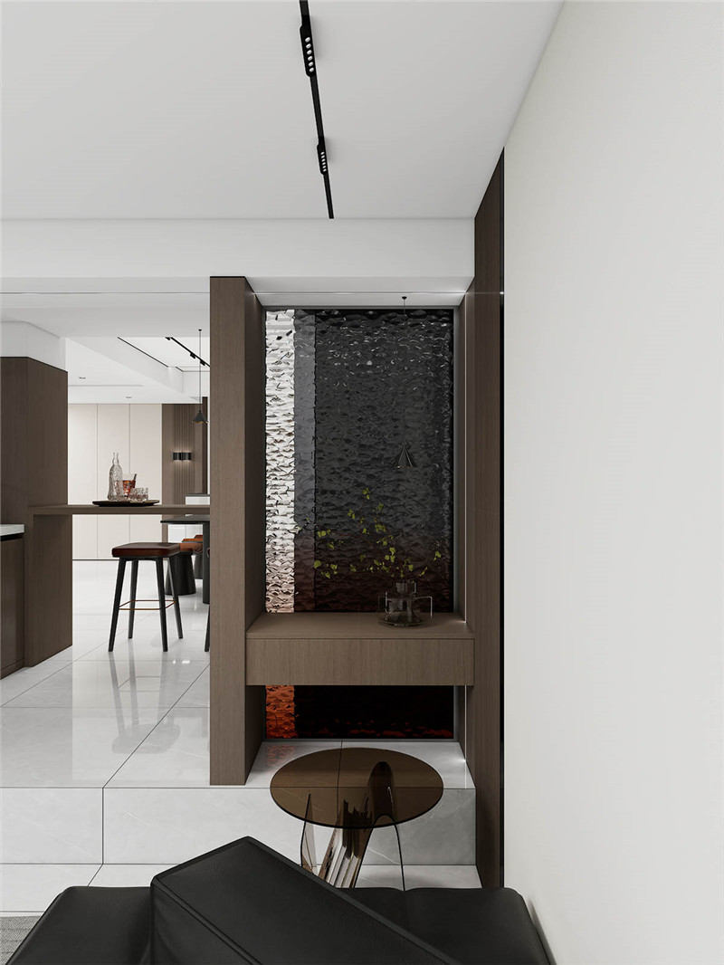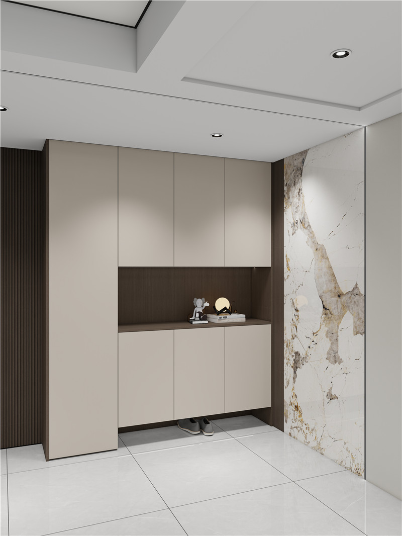 入戶玄關(guān)區(qū),定制柜與墻面無縫銜接,呈現(xiàn)完整塊面感;對面背景墻則以簡約造型疊加迎客松造景,在無主燈燈光映照下,構(gòu)筑一幅靈動禪意的藝術(shù)畫面。