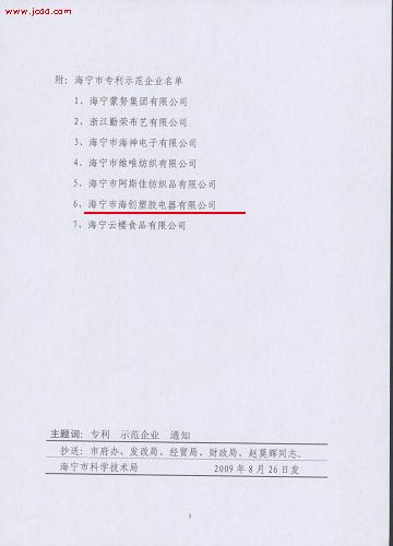 為進(jìn)一步強(qiáng)企業(yè)專利制度建設(shè),推進(jìn)企業(yè)技術(shù)進(jìn)步和自主創(chuàng)新,增強(qiáng)企業(yè)核心競(jìng)爭力,根據(jù)《海寧市專利示范企業(yè)管理(試行)辦法》的規(guī)定,經(jīng)海寧市科技局審核,海寧市海創(chuàng)塑膠電器有限公司被授予海寧市專利示范企業(yè)稱號(hào)。